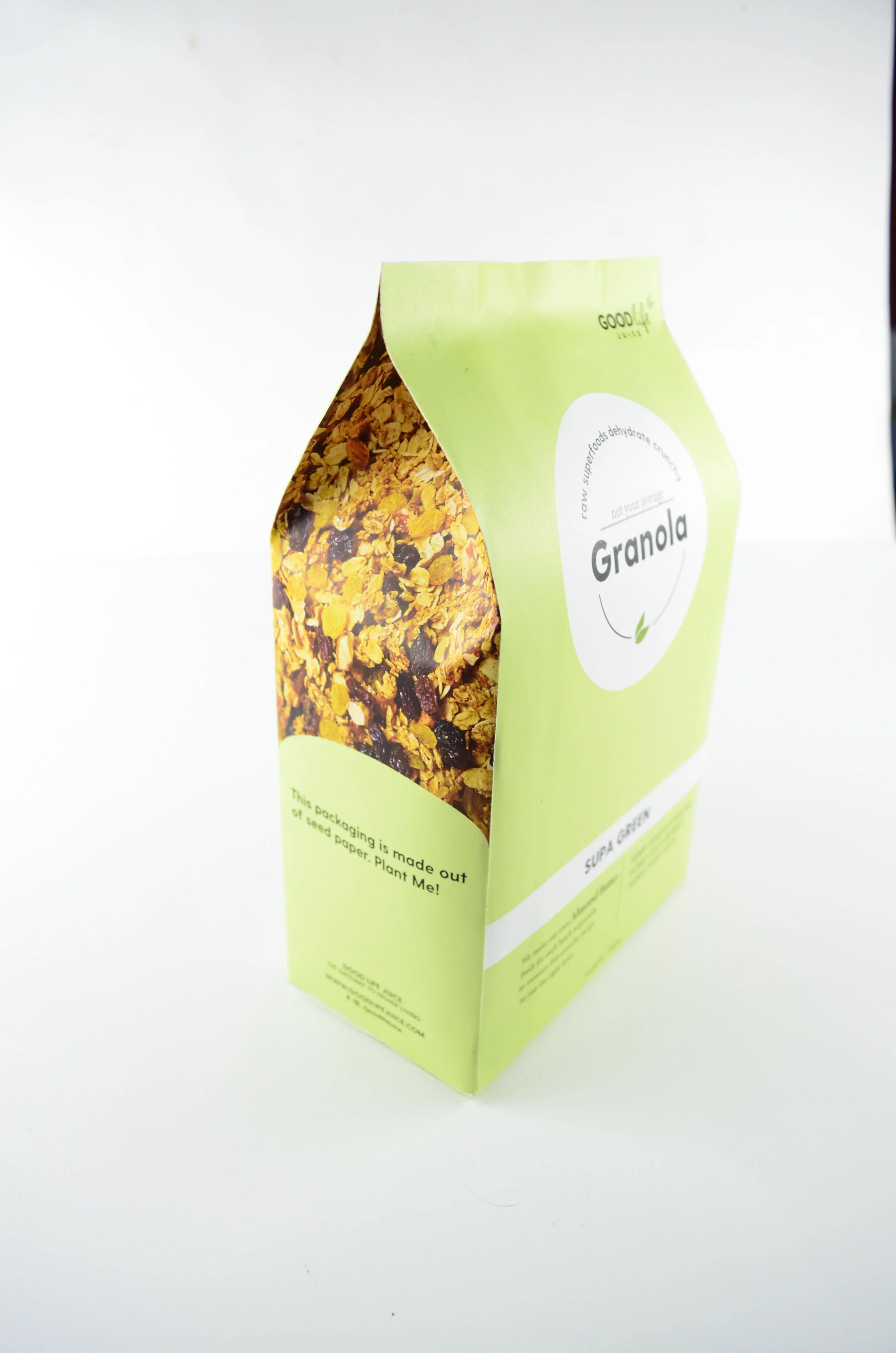 create a package for the new series of superfood granola, make it look unique classic elegant and fit into the existing good-life juice brand.